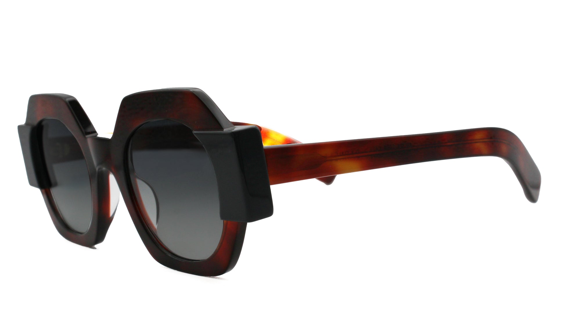 Slightly oversized square-shaped sunglasses. Acetate frame front and temples in reddish brown. Grey gradient tint 2-base lens with 100% UV protection and anti-reflective treatment. Category 3 lenses. Built-in acetate nose pads. Handmade.