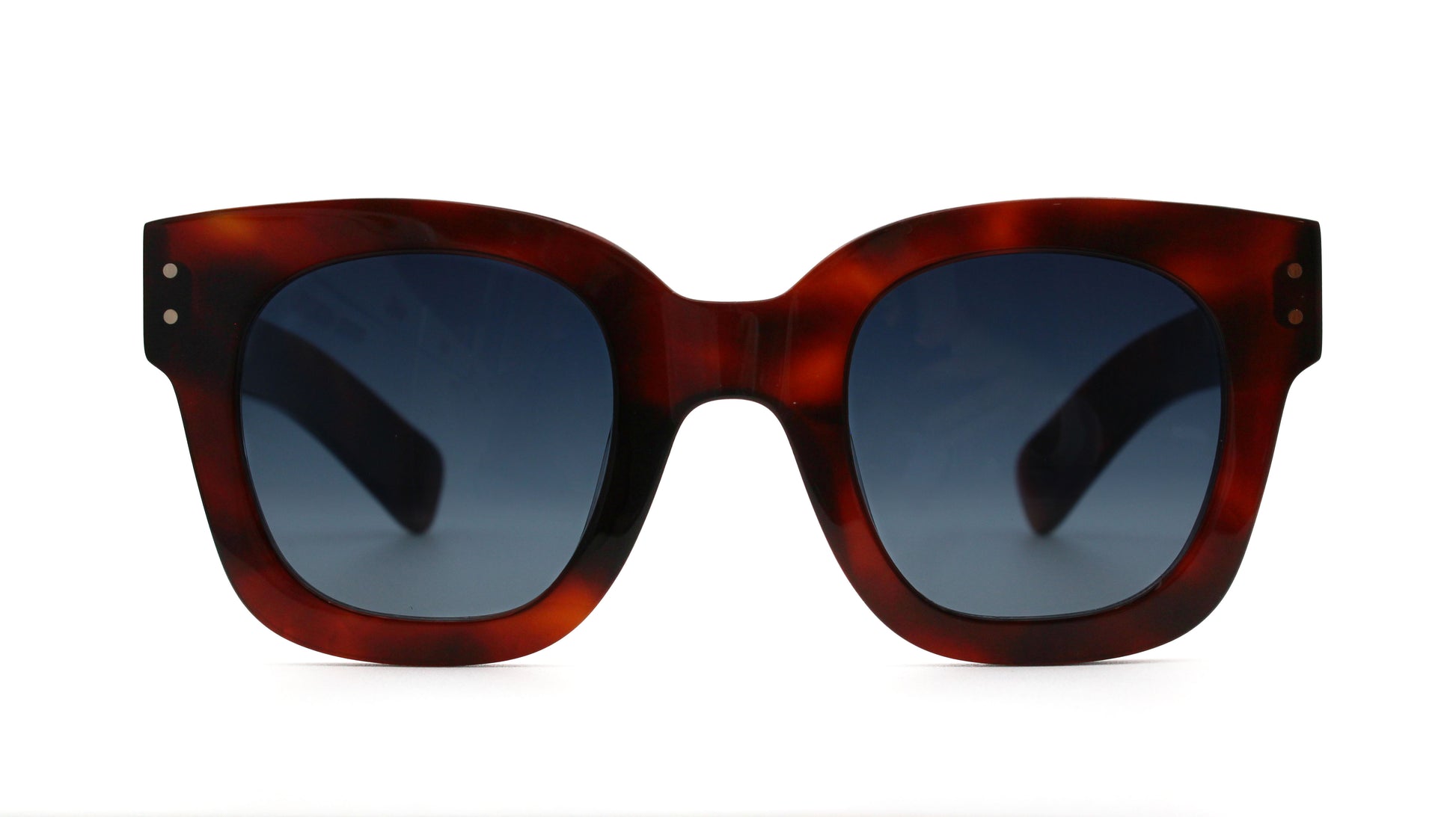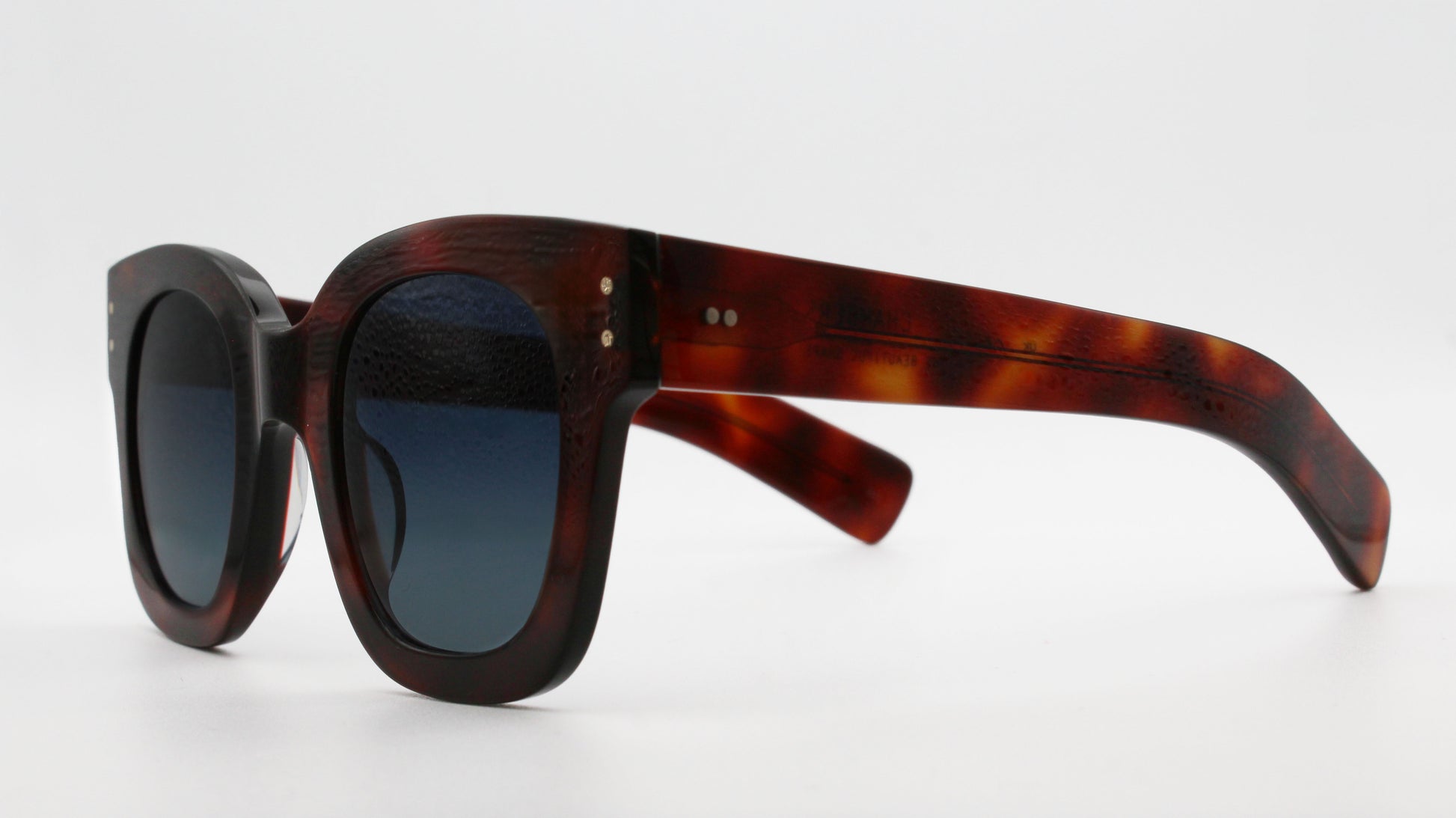 Sunglasses in monochrome red brown tortoiseshell acetate. Slightly oversized square shape. Acetate temples. Hinges with golden rivets on end elbow pieces and temples. Dark blue tint base 2 lenses with 100% UV protection and anti-reflective treatment. Category 3 lenses. Built-in acetate nose pads. Handmade.